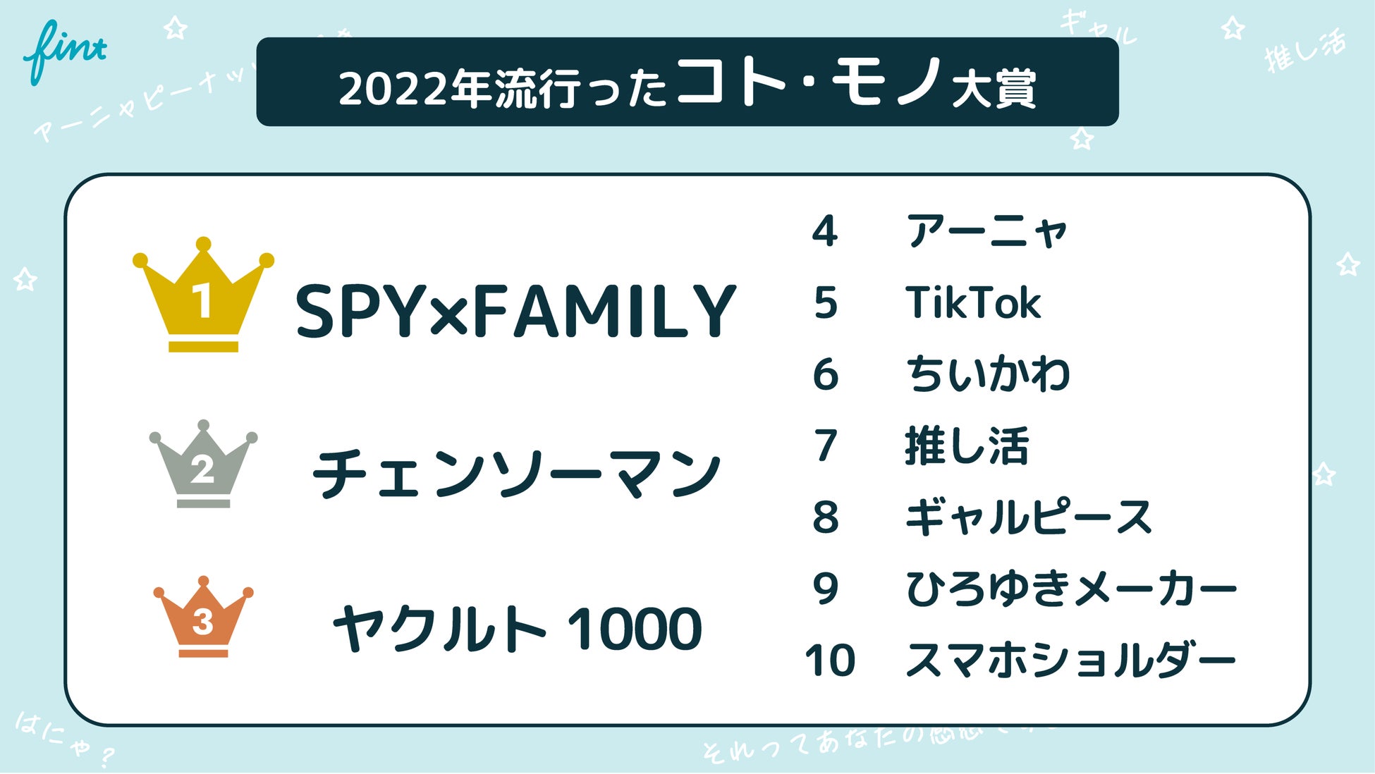 2022年大人気となったアニメSPY×FAMILYの主人公アーニャのセリフが流行語として1位に。幼い女の子の可愛らしい声で、このセリフはTikTokでオリジナル音源が作られるほどの人気となりました。