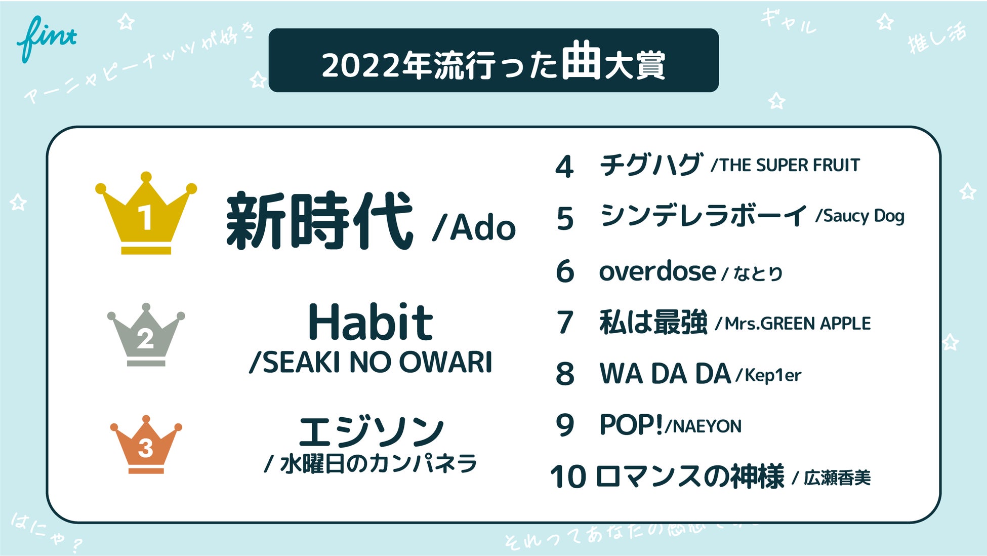 ランクインした曲のほとんどがTikTok上での使用が多く、TikTokでバズるかどうか、たくさん使用してもらえるかどうかがヒット曲の鍵に!気づけば耳にしている、口ずさんでいる楽曲が並んでいます。
