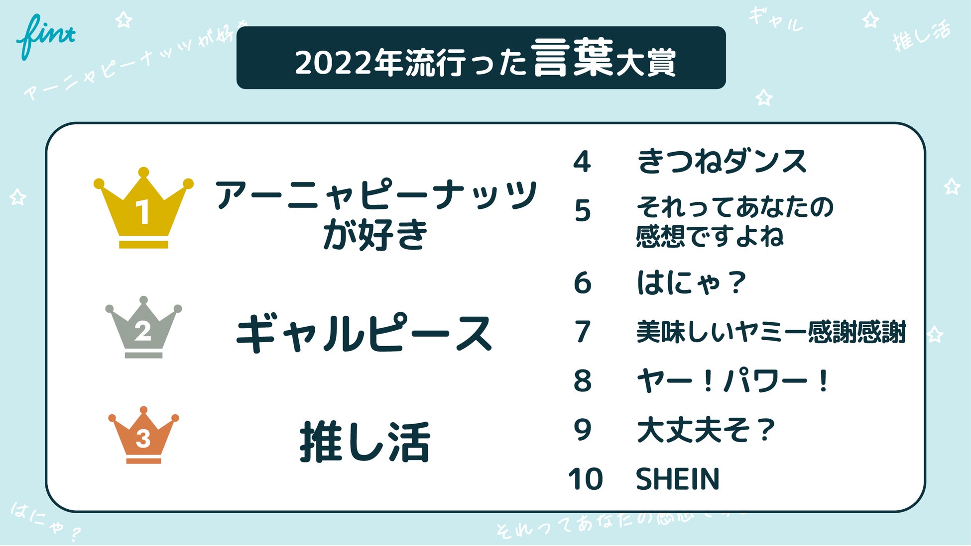 ランクインの結果から、TikTokが大きく影響していることがわかるでしょう。2位のギャルピースや3位の推し活はまさに2022年のカルチャートレンドが表れています。TikTok上でダンス動画が流行した「きつねダンス」や、ひろゆき氏の声を使用できるひろゆきメーカーから「それってあなたの感想ですよね」というワードを使った動画も多く見られました。