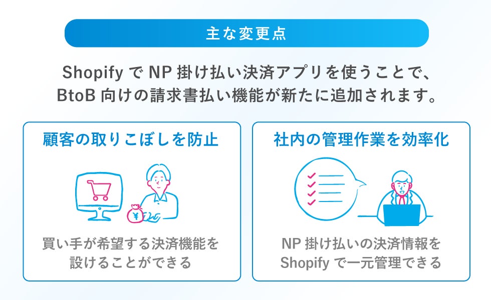 こうした背景から「Shopify」は、すべての人のためにコマースをより良くし、あらゆる場所にいる消費者に優れたショッピング体験を提供すべく、「NP掛け払い」を国内初のBtoB向け決済機能としてアプリストアへ導入するに至りました。