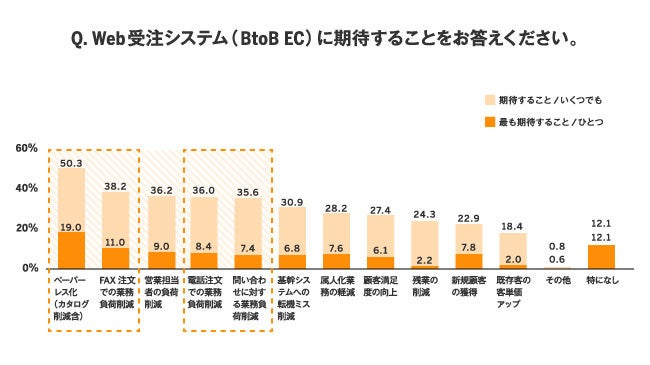 2. BtoB ECへの期待と、BtoB EC導入企業が導入後に感じている効果のうち、上位5項目中4項目が一致 (複数回答可)。電話・FAX注文での業務負荷削減をはじめ、期待通りの効果を実感していると見られる。