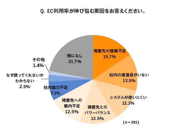 5. BtoB ECの利用率が伸び悩む要因として、 利用者がデジタルへの切り替えにハードルを感じていること、ECを社内に浸透させるためのリソース不足などがうかがえる。