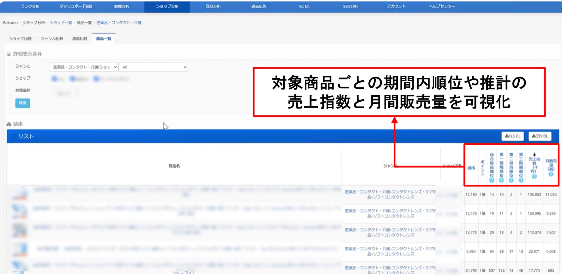 • 他社の取扱い商品ごとの期間内のランキング順位変動や推定売上の差異を特定することが可能