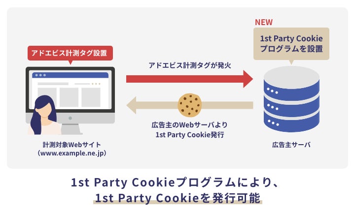 そこで、アドエビスはCookie規制の範囲内で正確なデータ計測を実施できる仕組みとして、JavaScriptによる1st Party Cookieの発行から、広告主のWebサーバによる1st Party Cookieの発行へ切り替えることのできる「1st Party Cookieプログラム」を開発いたしました。広告主のWebサーバに1st Party Cookieプログラムを設置いただくことにより、計測対象Webサイトにてアドエビスの計測タグ発火時にサーバ側で発行される1st Party Cookieを用いた計測が可能になります。