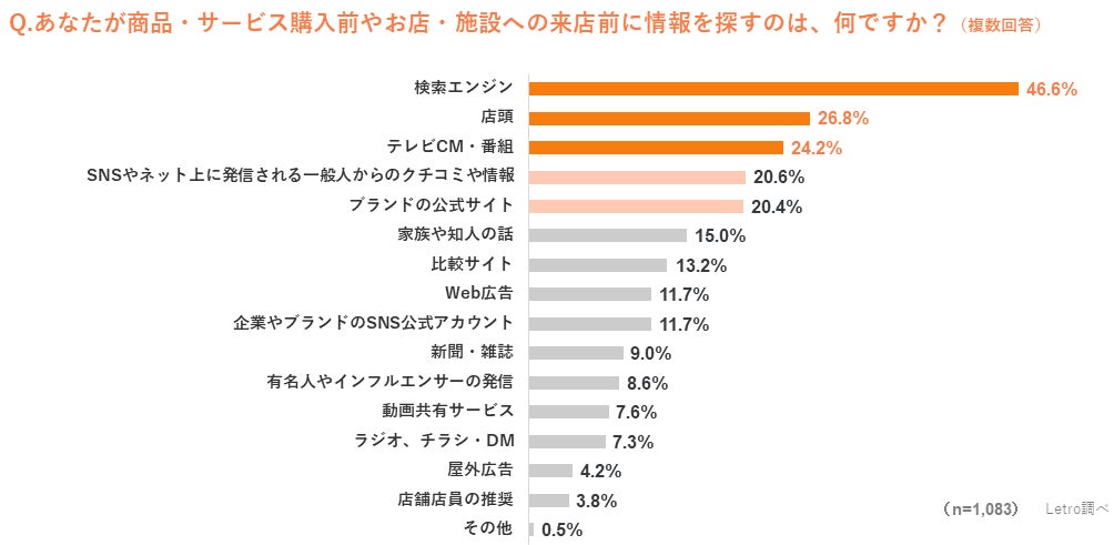 「購入・来店前に情報を探す場所」について聞いたところ、「検索エンジン(46.6%)」がトップとなり、「店頭(26.8%)」「テレビCM・番組(24.2%)」「SNSやネット上に発信される一般人からのクチコミや情報(20.6%)」「ブランドの公式サイト(20.4%)」が続く結果となりました。10~30代は「ブランド公式サイト」より「一般人のクチコミ」を利用している割合が高く、企業発信のコンテンツよりも、生活者発信のコンテンツを求めていることがわかります。
