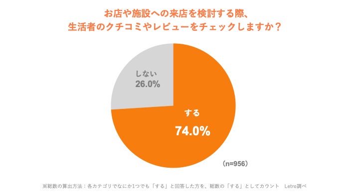 さらに、「お店や施設に来店する」と回答した方に対して、「お店や施設への来店を検討する際のUGCのチェック状況」を聞いたところ、約7割がUGCをチェックしていることがわかりました。さらに、施設のカテゴリ別にみると傾向が大きく異なっていました。「飲食店(58.2%)」や「レジャー施設(53.5%)」では約半数がUGCをチェックすると回答していますが、日常的に利用される「スーパーマーケット(28.2%)」や「デパートなどの総合型施設(29.7%)」では3割を切る結果となっており、初めて行く施設や利用頻度が低い施設では特にUGCがチェックされていると考えられます。