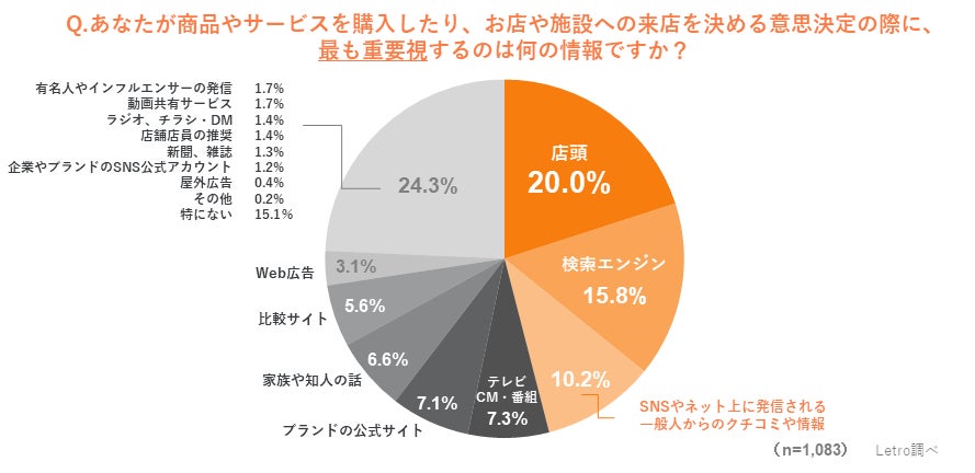さらに、「購入や来店の意思決定の際に、最も重要視する情報」について聞いたところ、TOP3は「店頭(20.0%)」「検索エンジン(15.8%)」「SNSやネット上に発信される一般人からのクチコミや情報(10.2%)」の順となりました。「店頭」「検索エンジン」「SNSやネット上に発信される一般人からのクチコミや情報」の3つは、「知るきっかけ」から「情報検索」、「意思決定」の全てのフェーズにおいて多くの回答を集めており、生活者の購買行動において重要な情報源となっていることがわかります。
