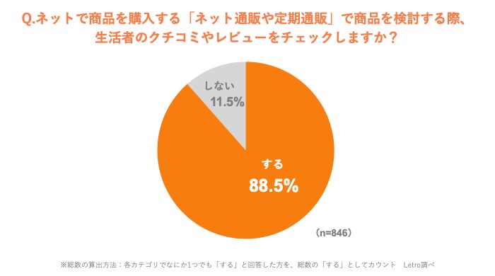 「ネット通販や定期通販で商品を購入する」と回答した方に対して、「ネット通販や定期通販での購入検討時のUGCのチェック状況」を聞いたところ、全体の88.5%がUGCをチェックすることが明らかになりました。Letroが実施した「生活者のUGCに対する意識調査 2022」においては、全体の64.6%が「購買の際にUGCを信頼する」と回答をしていましたが、「ネット通販や定期通販」にフォーカスするとそれを24ポイントも上回ることから、ネットショッピングの際はよりUGCが重要視されると言えるでしょう。