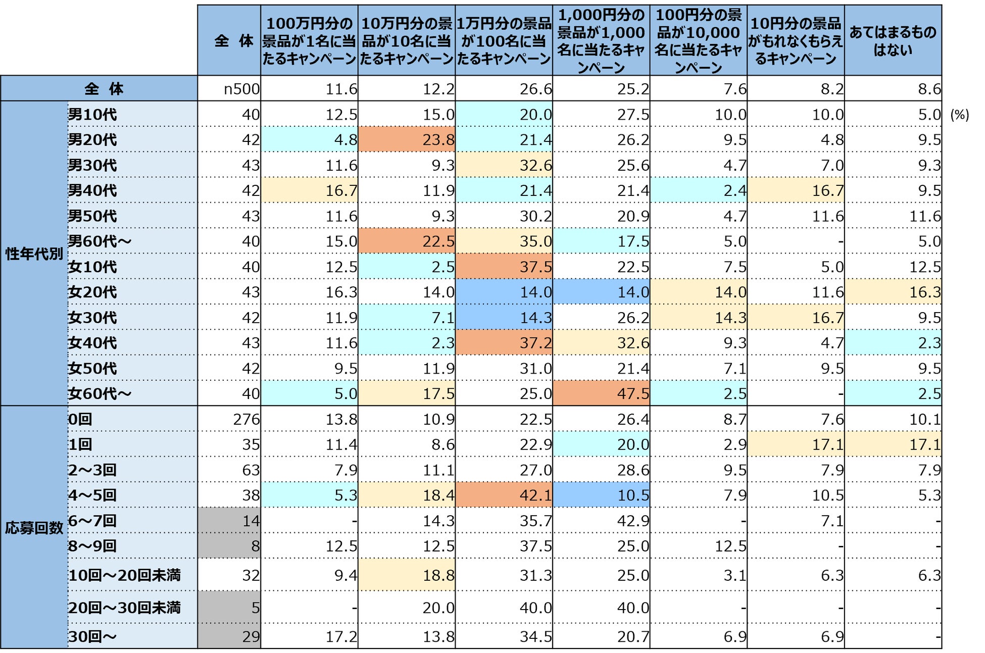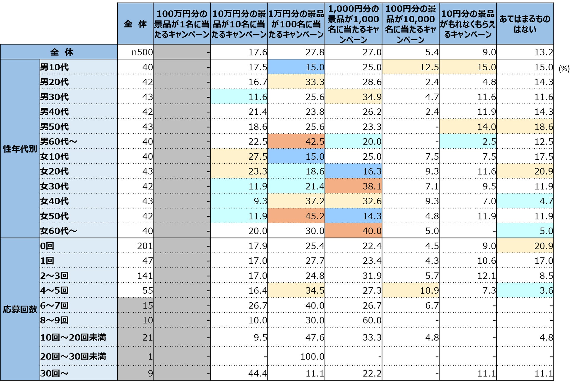 オープンキャンペーンへの応募回数別に見ると、4~5回という応募回数の多い層で、全体1位に選ばれた「10,000円×100名」への支持が特に高い結果となりました。よくキャンペーンに応募する人にとって、これが最もバランスの取れた当選額と当選確率の組合せであるかもしれません。