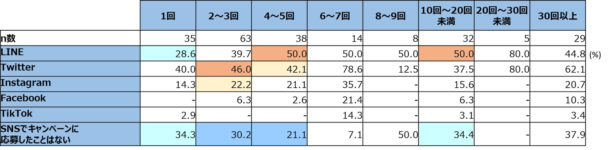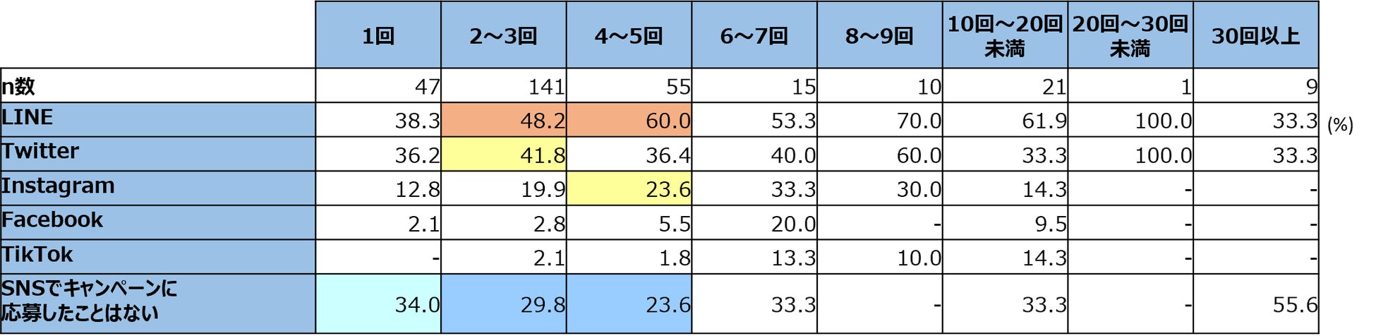 SNSアカウントでプレゼントキャンペーンに応募した経験を応募回数別に分類しました。オープンキャンペーン、クローズドキャンペーンともに、2回以上の応募経験がある⼈は、1回だけの応募経験の⼈に⽐べて、LINEやTwitterで実施されるキャンペーンにより参加している傾向が読み取れます。LINEやTwitterから⼿軽に応募できることが複数回応募を促すとコツと⾔えそうです。