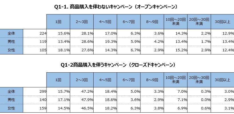 商品購⼊を伴わないキャンペーンでは2〜3回応募が28.1%と最も多いですが、10回以上応募のヘビー層も29.4%とほぼ同数存在していることが明らかになりました。反対に商品購⼊を伴うキャンペーンでは2〜3回応募がボリュームゾーンで47.2%となっており、全体としても5回以下応募が8割以上を占めています。また、オープンキャンペーンと異なり10回以上応募のヘビー層は約10%に留まる結果となりました。
