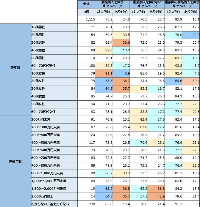 商品購⼊を伴うキャンペーン、伴わないキャンペーンともに応募経験は約25%となりました。また、複数回の購⼊で応募できるキャンペーンの応募経験は16%とやや低い結果です。「商品購入を伴うキャンペーン」では、30代男性、20代女性、30代女性の応募率が高く、「商品購入を伴わないキャンペンでは、30代女性、60代以上女性の応募率がやや低い傾向にありました。また、世帯年収別では、年収が高い層ほどキャンペーン応募経験率が高いという結果となりました。