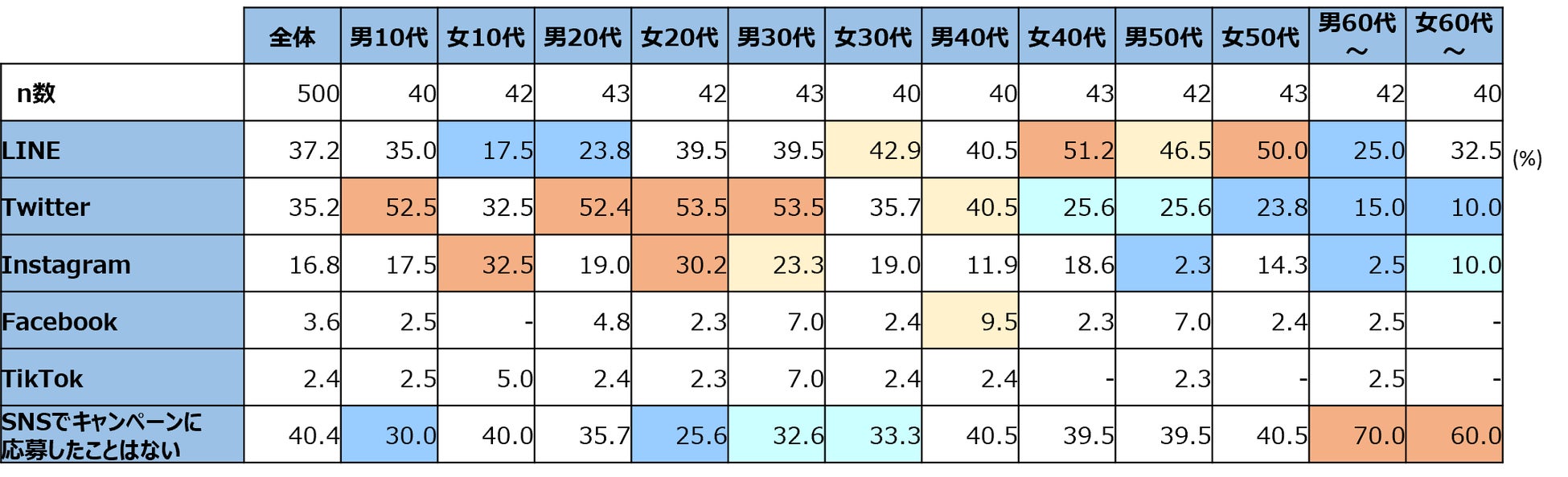 いままでに自身のSNSアカウントでプレゼントキャンペーンに応募した経験を性年代別に尋ねてみたところ、男性では50代から、女性では40代から、いずれのSNSにおいてもプレゼントキャンペーンへの応募経験率は低くなりますが、LINEについては、30代~50代の女性の応募経験率が高いです。また、10代~30代男性、20代女性ではTwitter、10代~20代の女性はInstagramからのプレゼントキャンペーンへの応募経験率が高い傾向となりました。
