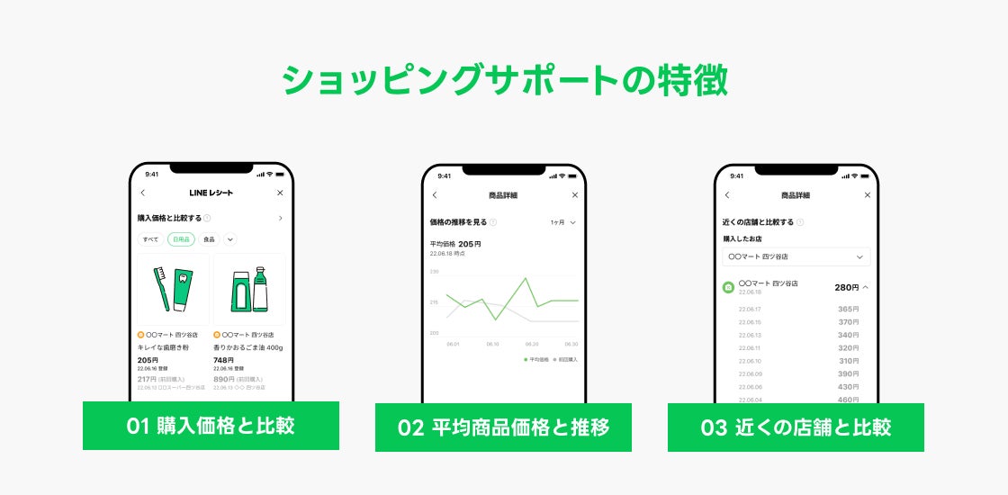 「LINEレシート」では、そのような「買い回りをして価格比較をするのは面倒」「どの店舗で買うのがお得かわからない」といった不便さに対して、レシート情報を活用し、スーパーやドラッグストア等の価格比較ができる新機能「ショッピングサポート」の先行提供を開始いたします。