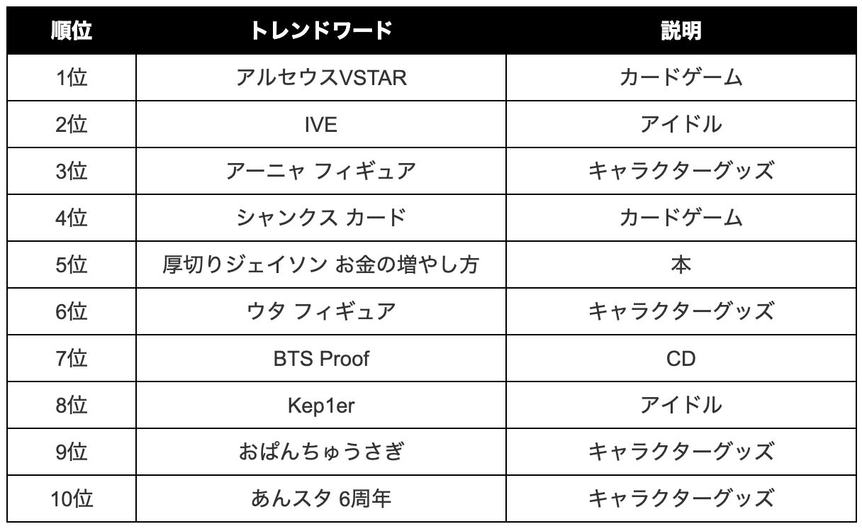 そして、3位には今年放送開始したTVアニメSPY×FAMILYのなかでも人気の高い「アーニャ」の「フィギュア」がランクイン。5位の「厚切りジェイソン お金の増やし方」は累計50万部を売り上げた人気書籍であり、検索数が上昇しました。