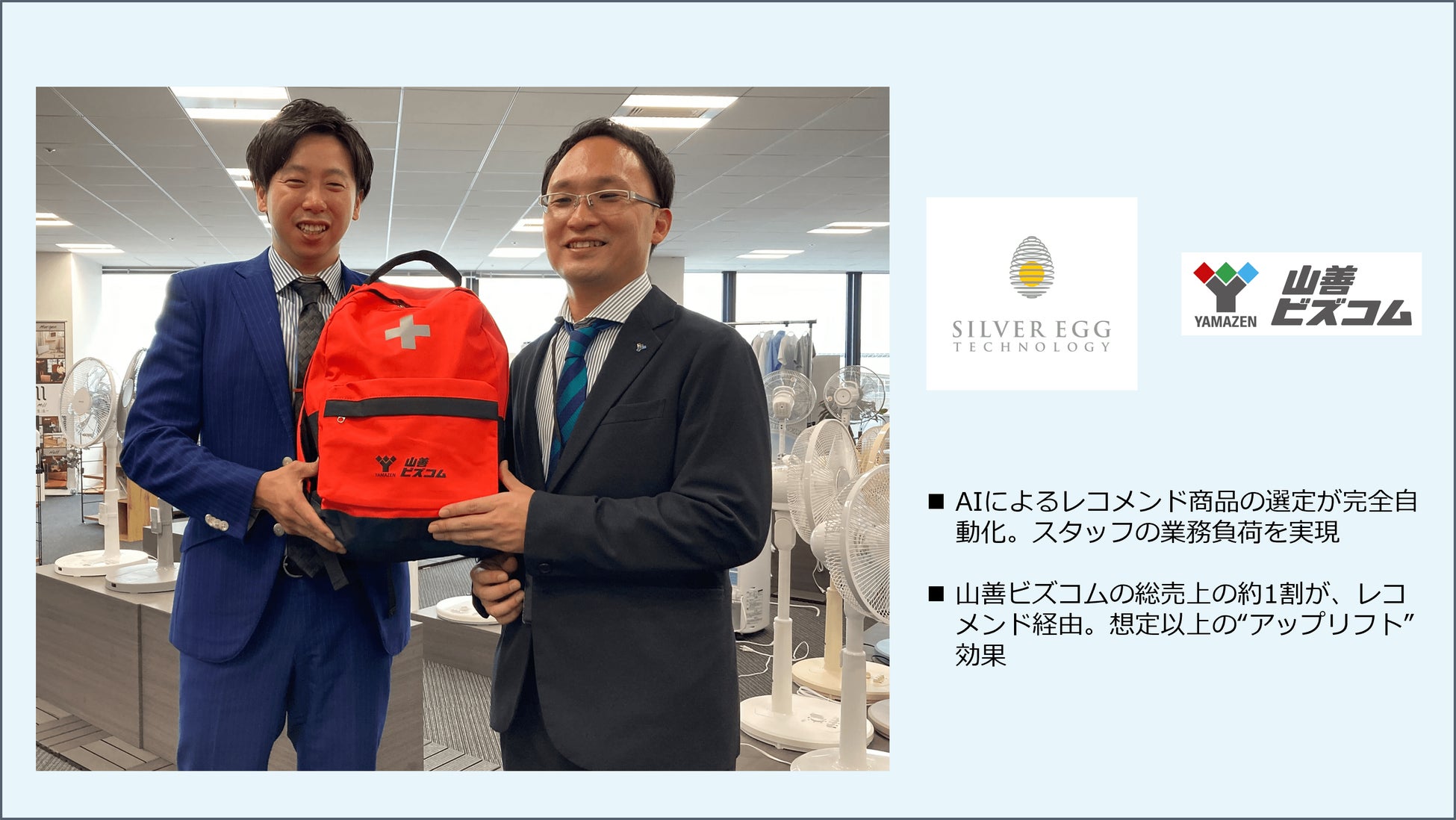 シルバーエッグ・テクノロジー株式会社(本社:大阪府吹田市、代表取締役社長&CEO:トーマス・フォーリー、証券コード 3961、以下 シルバーエッグ)は、同社が開発・提供するAI技術を用いたリアルタイム・レコメンドサービス「アイジェント・レコメンダー」を2022年5月に導入した株式会社山善(本社:大阪府大阪市、代表取締役社長:長尾 雄次、以下 山善)のB2B向けECサイト“山善ビズコム”(https://yamazenbizcom.jp/)において、アイジェント・レコメンダーによる売上実績(*)が同サイトの月間総売上の10%以上を占めるという効果を確認しましたので、これをお知らせいたします。また、本件に関するインタビューを山善ビズコムご担当者様に行いましたので、併せてご覧ください。