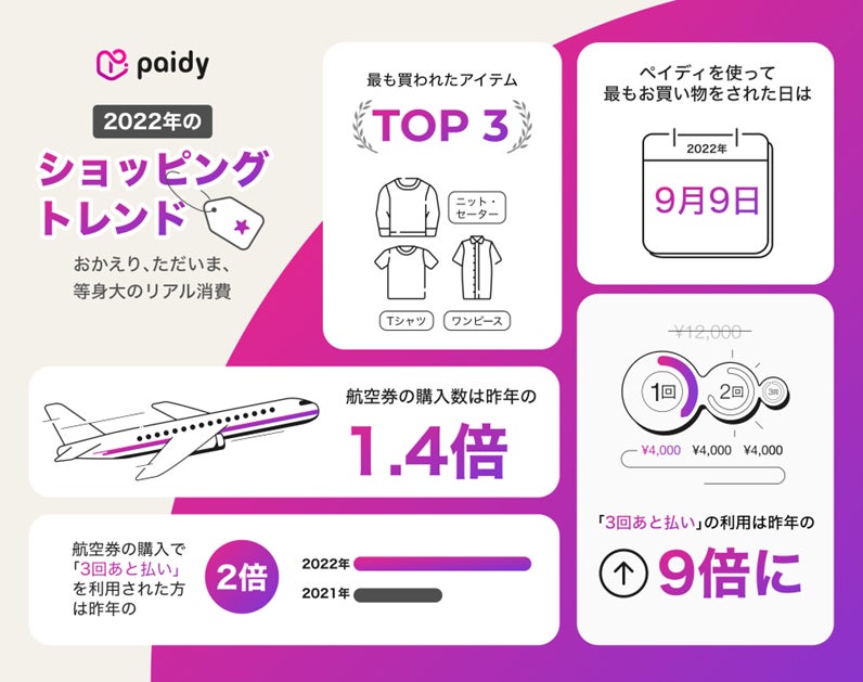 あと払い(Buy Now Pay Later)サービス「ペイディ」を提供する株式会社Paidyは、このたび、ペイディのお客様の2022年のお買い物トレンドをまとめましたのでご報告します。2022年は、歴史的な円安などによる物価上昇が見られたものの、新型コロナウイルスによる行動規制が3年ぶりに緩和され、旅行などのお出かけ需要が高まり、徐々に外向きの消費傾向が見られました。