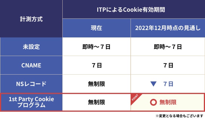 なかでも、Apple社のSafariブラウザに追加されているトラッキング防止機能「Intelligent Tracking Prevention(以下、ITP)」においては、「ITP2.1」のリリース以降、JavaScriptが発行するCookie(document.cookieで生成するCookie)の有効期間が最大で7日間になるなど、年々制限が厳格化しています。今後のアップデートとして、3rd PartyのIPアドレスから付与されたCookieに対しての規制強化も発表されており、NSレコード方式による計測についてもCookieの有効期間が短縮される可能性がございます。