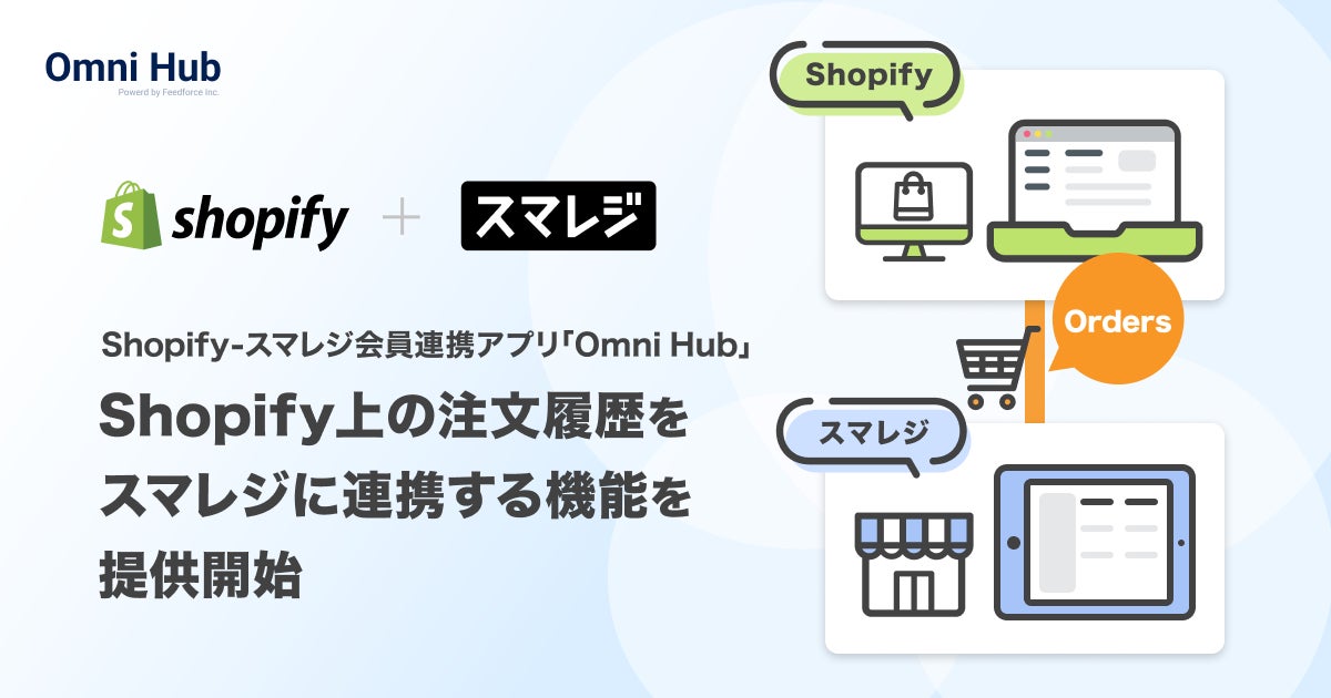 Shopify(ショッピファイ) – スマレジ間のオムニチャネル会員連携アプリ「Omni Hub」(株式会社フィードフォース、所在地:東京都文京区、代表取締役:塚田 耕司)は、Shopifyで構築したオンラインストアの注文履歴もスマレジへ連携する機能を公開いたしました。