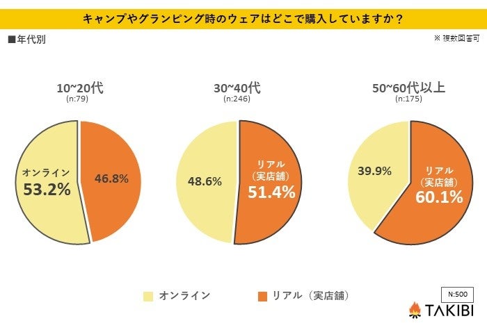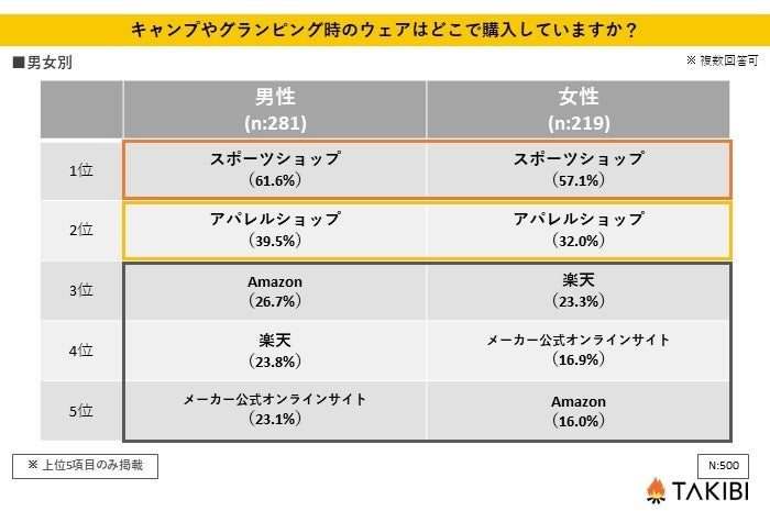 キャンプやグランピングを中心としたアウトドア総合情報サイト「TAKIBI」の運営をおこなう株式会社フォーイットは、全国の10代~60代までの男女500人を対象にアウトドアウェアに関するアンケートを実施し、男女別・年代別等の特徴についてまとめました。