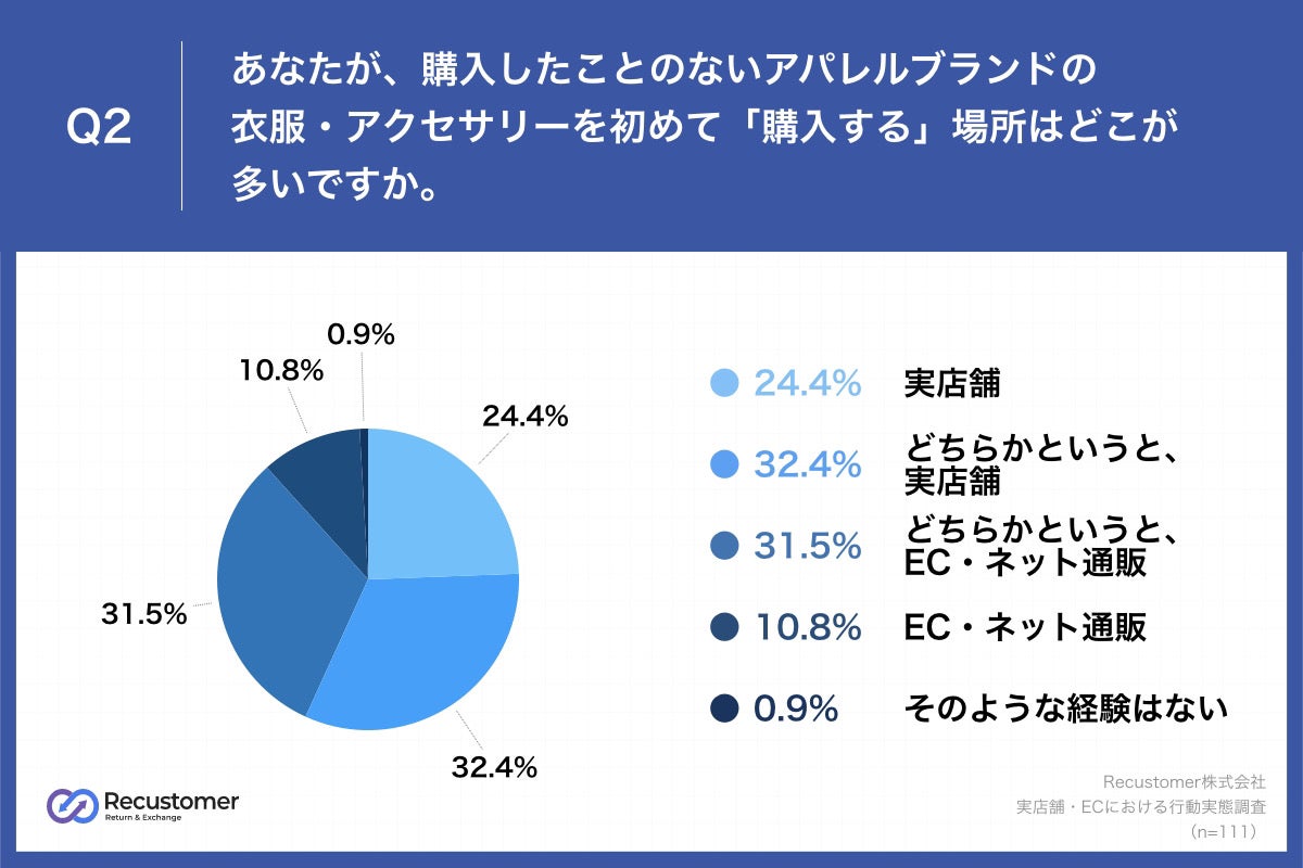 次に、消費者が買ったことのないブランドを購入する場所としてECと実店舗ではどちらが多いのかを調べるために、「Q2.あなたが、購入したことのないアパレルブランドの衣服・アクセサリーを初めて「購入する」場所はどこが多いですか。」(n=111)と質問したところ、「実店舗」が24.4%、「どちらかというと、実店舗」が32.4%という回答となりました。