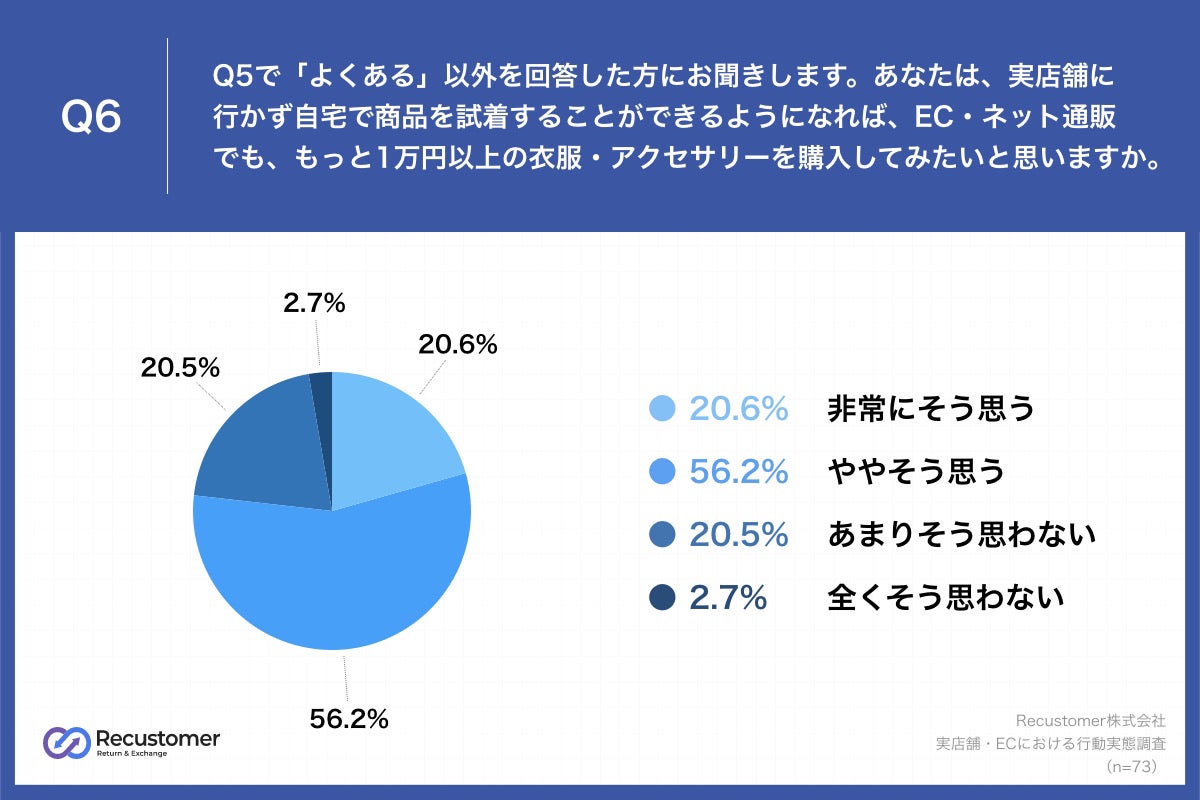 実際に商品を見ることができればECでも1万円以上の商品を購入する可能性が高まるかを調べるため、Q5で「よくある」以外を回答した方に、「Q6.あなたは、実店舗に行かず自宅で商品を試着することができるようになれば、EC・ネット通販でも、もっと1万円以上の衣服・アクセサリーを購入してみたいと思いますか。」(n=73)と質問したところ、「非常にそう思う」が20.6%、「ややそう思う」が56.2%という回答となりました。