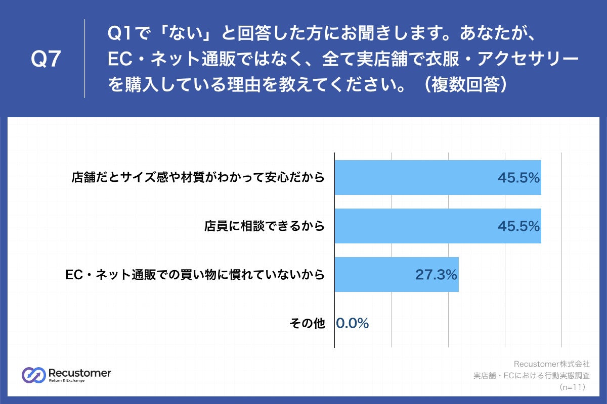 ECでアパレルを購入したことのない消費者は、どういった要素があればECで購入するのかを調査するため、Q1で「ない」と回答した方に、「Q7.あなたが、EC・ネット通販ではなく、全て実店舗で衣服・アクセサリーを購入している理由を教えてください。(複数回答)」(n=11)と質問したところ、「店舗だとサイズ感や材質がわかって安心だから」が45.5%、「店員に相談できるから」が45.5%、「EC・ネット通販での買い物に慣れていないから」が27.3%という回答となりました。
