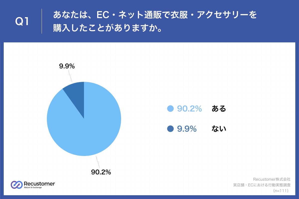 まず初めに、調査対象者の購買行動における属性を明らかにするため「Q1あなたは、EC・ネット通販で衣服・アクセサリーを購入したことがありますか。」(n=111)と質問したところ、「ある」が90.2%、「ない」が9.9%という回答となりました。