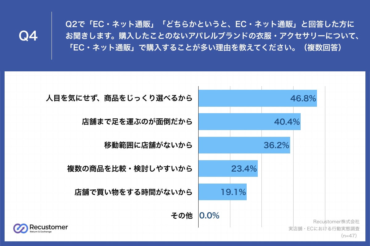 Q2で「EC・ネット通販」「どちらかというと、EC・ネット通販」と回答した方に、「Q4.購入したことのないアパレルブランドの衣服・アクセサリーについて、「EC・ネット通販」で購入することが多い理由を教えてください。(複数回答)」(n=47)と質問したところ、「人目を気にせず、商品をじっくり選べるから」が46.8%、「店舗まで足を運ぶのが面倒だから」が40.4%、「移動範囲に店舗がないから」が36.2%という回答となりました。