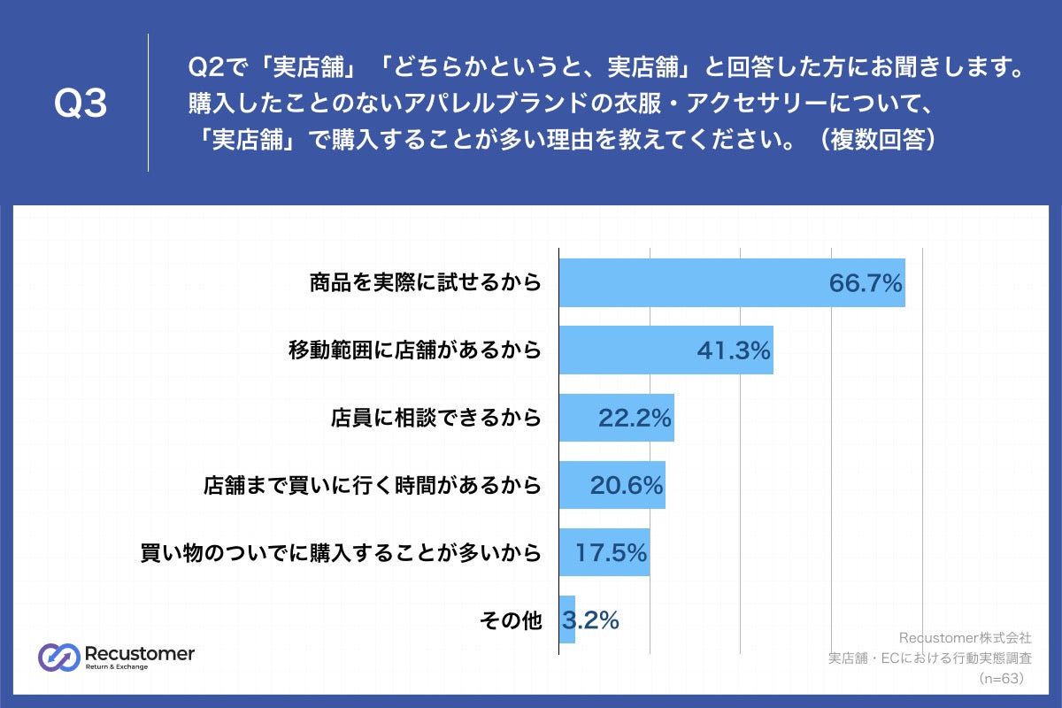 Q2で「実店舗」「どちらかというと、実店舗」と回答した方に、「Q3.購入したことのないアパレルブランドの衣服・アクセサリーについて、「実店舗」で購入することが多い理由を教えてください。(複数回答)」(n=63)と質問したところ、「商品を実際に試せるから」が66.7%、「移動範囲に店舗があるから」が41.3%、「店員に相談できるから」が22.2%という回答となりました。