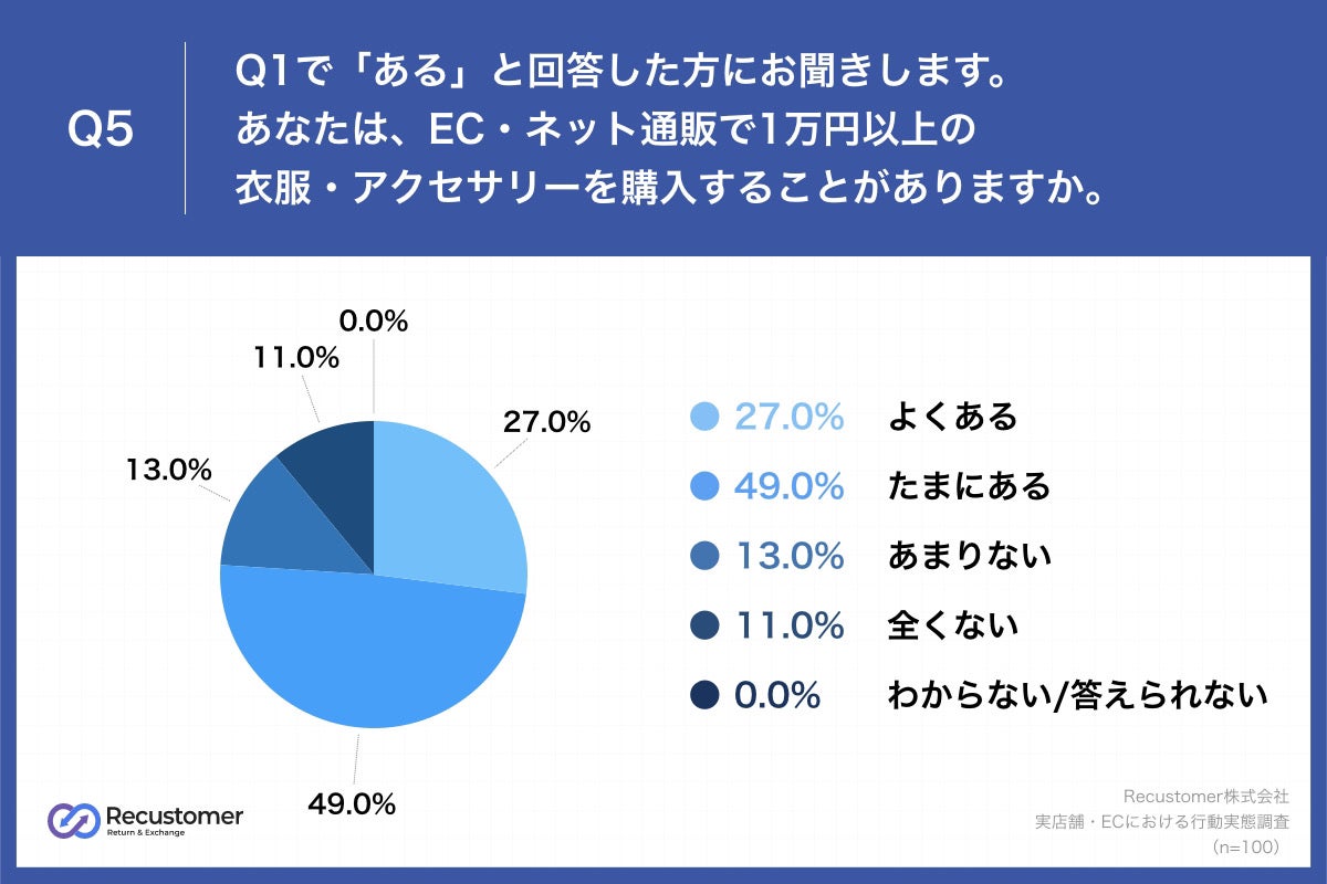 次にQ1で「ある」と回答した方に、1万円以上の高単価の製品に絞った際の購買行動を明らかにするため、「Q5.あなたは、EC・ネット通販で1万円以上の衣服・アクセサリーを購入することがありますか。」(n=100)と質問したところ、「よくある」が27.0%ととどまるという結果になりました。