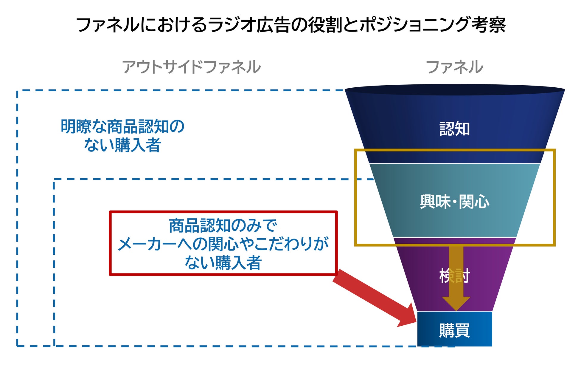 TOKYO FMでは、これまで多くの音声広告の購買効果検証を重ねてまいりました。それらの経験から、ラジオが提供社商品の購買促進に貢献する理由として、次の2つを考察しています。1つは、一社提供の番組やコーナーにおいて、エンターテインメント性を有した提供社商品の紹介をすることで、ファネルにおける認知はもちろん、興味・関心を高める顧客接点を創出しているためと考えております。もう1つは、商品認知はあり購入しているが、メーカーにこだわりがない、いわゆるアウトサイドファネルに対して、番組のファンが提供社のファンになることを促進することで提供社商品の購買につなげているためと考えております。
