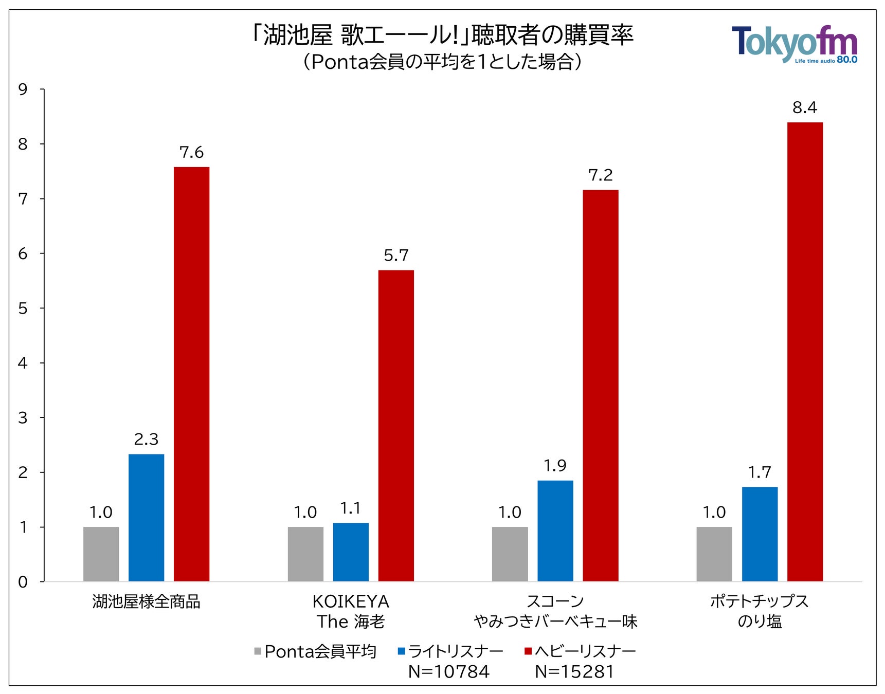 TOKYO FMは、CDP(Customer Data Platform)による広告効果検証基盤を利用して、株式会社湖池屋提供コーナー「湖池屋 歌エーール!」のradiko聴取データと、Pontaの湖池屋商品群の購買データを用いて、ラジオ出稿の購買への寄与を可視化するデータ分析を実施いたしました。