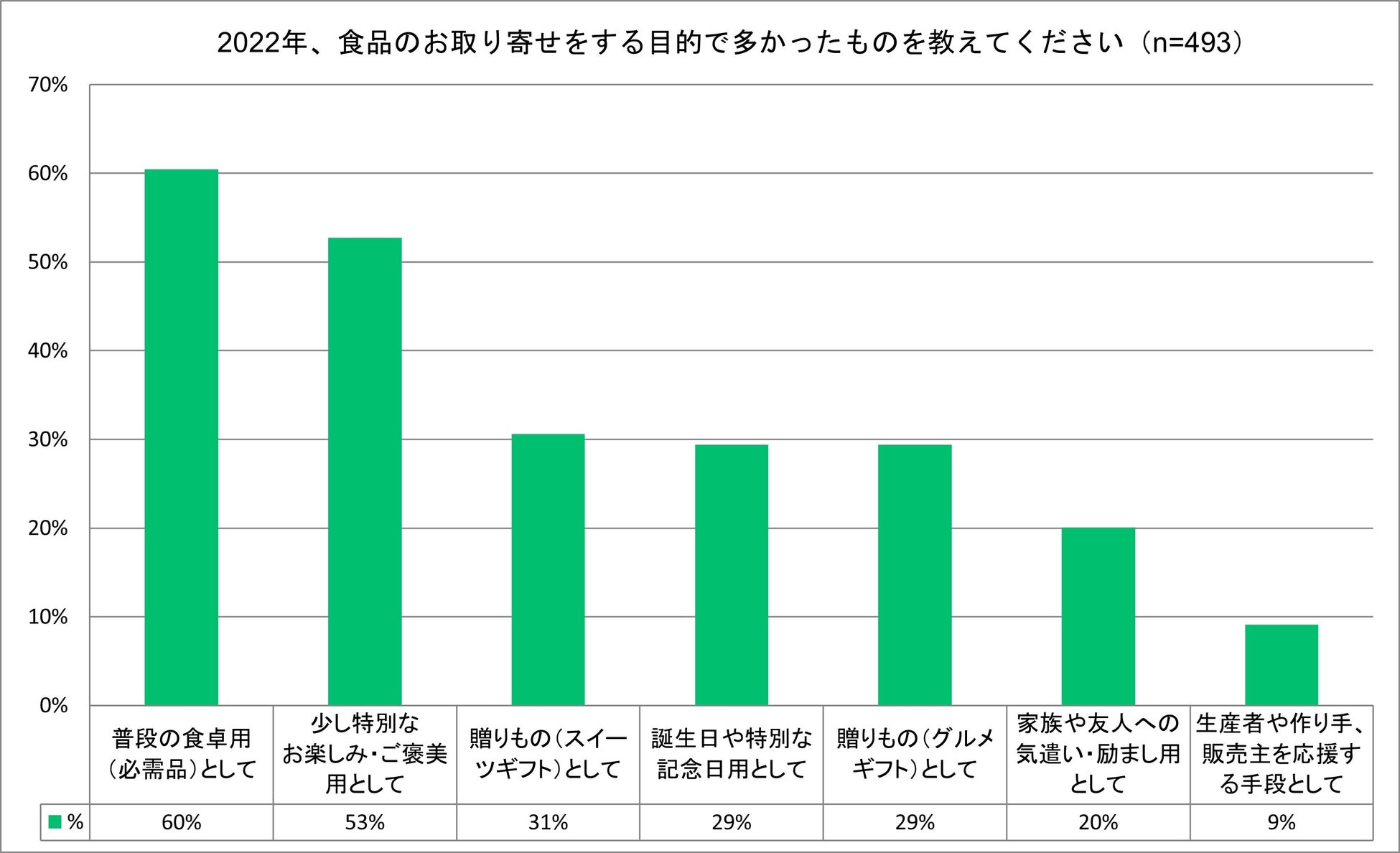 2022年の食品通販の購入目的として、「普段の食卓」が6割となりました。行動制限が緩和されたなかでも在宅時間を楽しんだり、毎日の食事の手助けとして食品通販を活用している様子が伺えます。一方で「ご褒美」に関しては前回調査から16ポイント減となりました。巣ごもりニーズで特別感やご褒美系の商品は伸長していましたが、人々の動きも活動的になり対面交流が増えてきたことが影響しているのではないでしょうか。