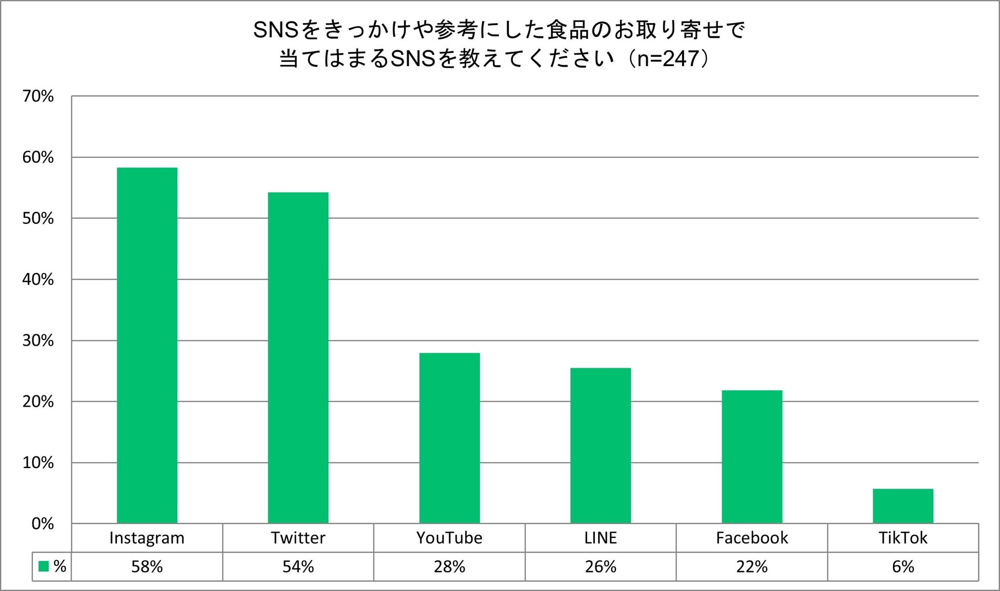 SNSをきっかけにして食品通販をしたことのある方は5割になりました。その中で多かったのが「Instagram(58%)」「Twitter(54%)」です。食品通販のマーケティングやプロモーションにおいてもより重要となってくると予想されます。