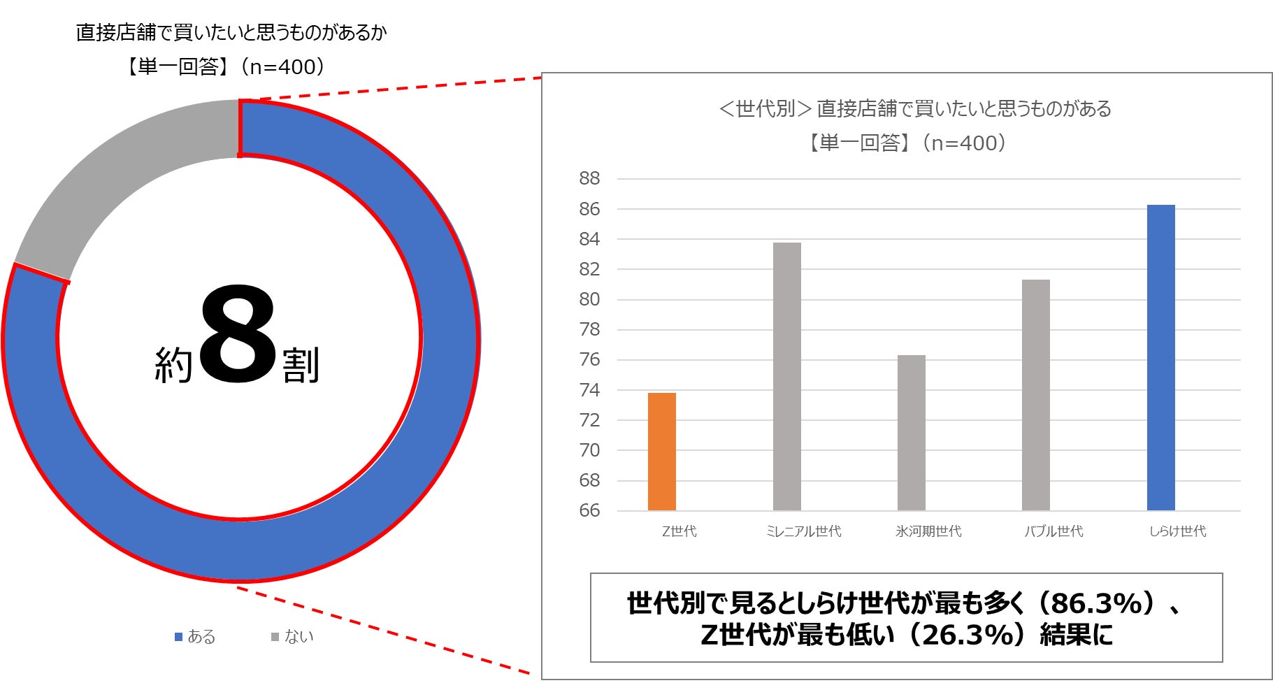 ●買い物をする際に、ネット上ではなく直接店舗で買いたいと思うものがある人が8割。Z世代が最も低く、約4人に1人(26.3%)が店舗で買いたいものがないと回答。