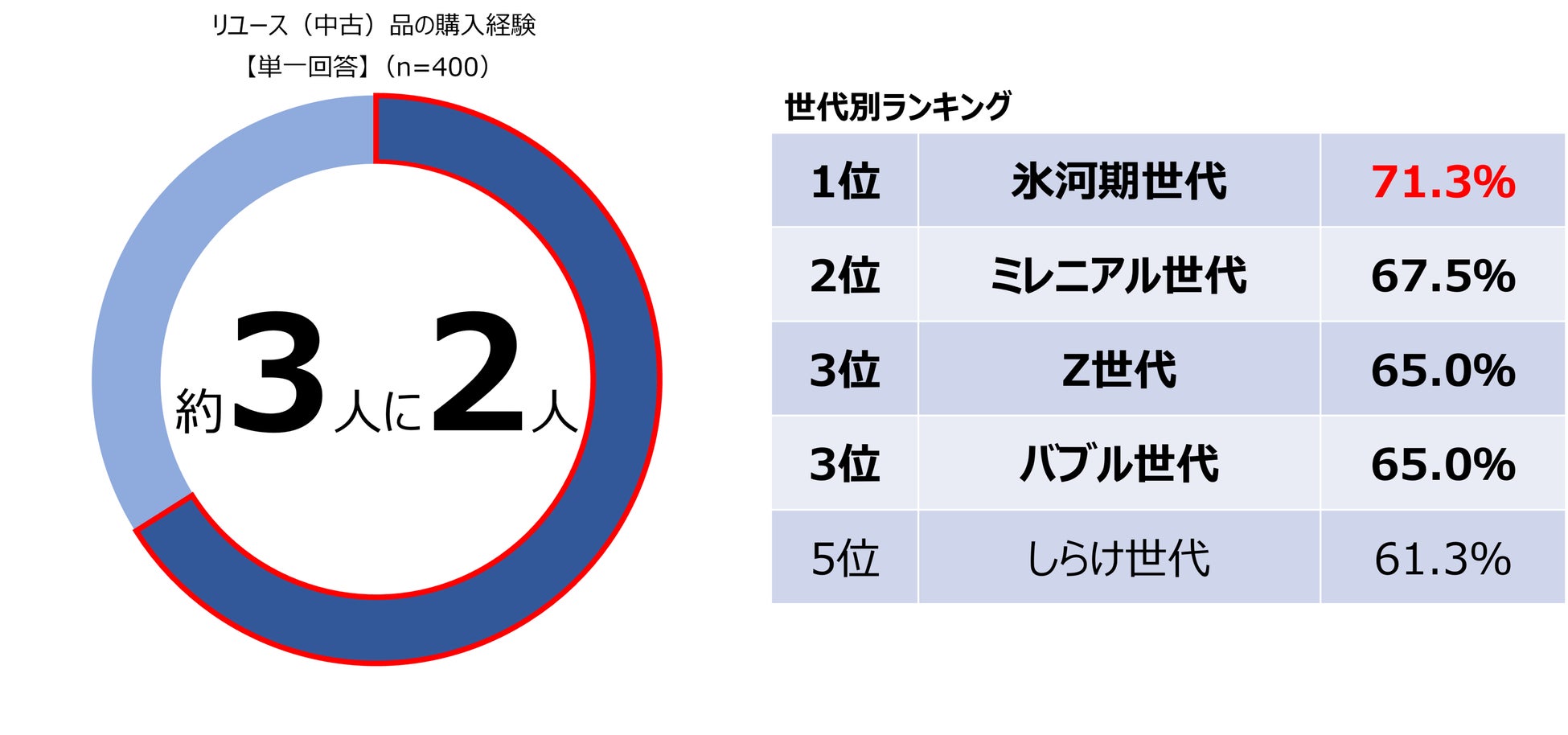 ●リユース品購入経験は約3人に2人(66.0%)があり、氷河期世代が最も高い(71.3%)結果に。