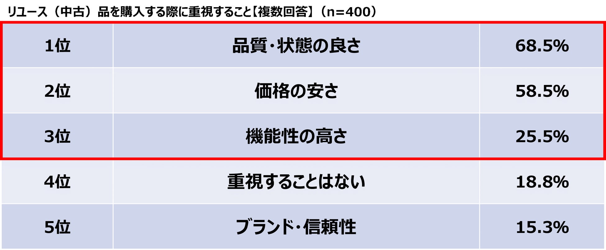 また、リユース(中古)品を購入するときに重視することを聞いたところ、上位3つは「品質・状態の良さ/68.5%」「価格の安さ/58.5%」「機能性の高さ/25.5%」となり、買い物全体と大きなランキング変動はないことがわかりました。リユース品でも品質・状態の良さが重視されており、新品市場と変わらないことが求められていることが推察できます。
