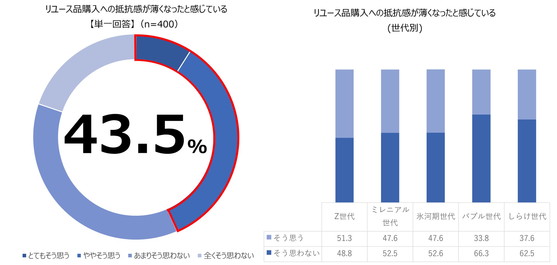 ✓リユース品購入への抵抗感が薄くなったと感じている人が43.5%。Z世代の2人に1人以上(51.3%)がリユースへの抵抗感が最も薄く、バブル世代が最も強い結果に。