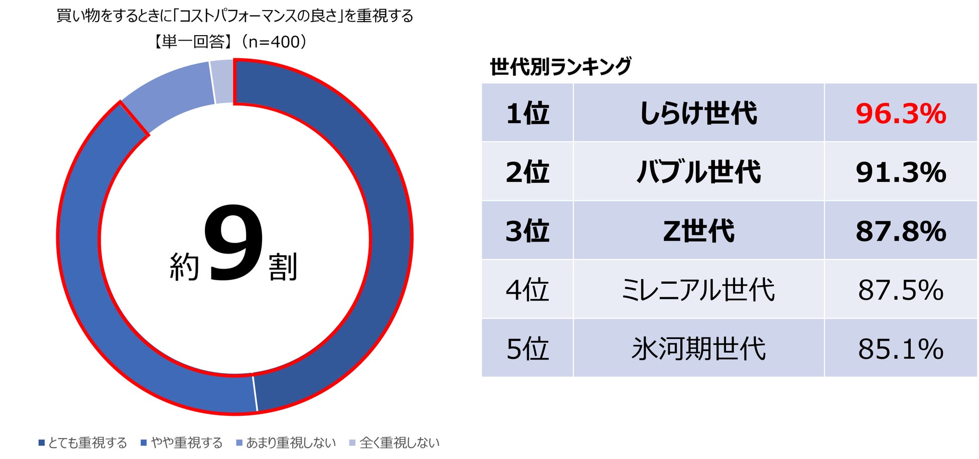 買い物をするときに「コストパフォーマンスの良さ」を重視するか聞いたところ、「とても重視する/48.0%」「やや重視する/40.8%」となり、88.8%の人がコスパを重視した買い物を行っている結果となりました。世代別に見ると、最もコスパを重視しているのがしらけ世代、次いでバブル世代と、年齢が高いほどコスパを重視した買い物をしている傾向が見えています。