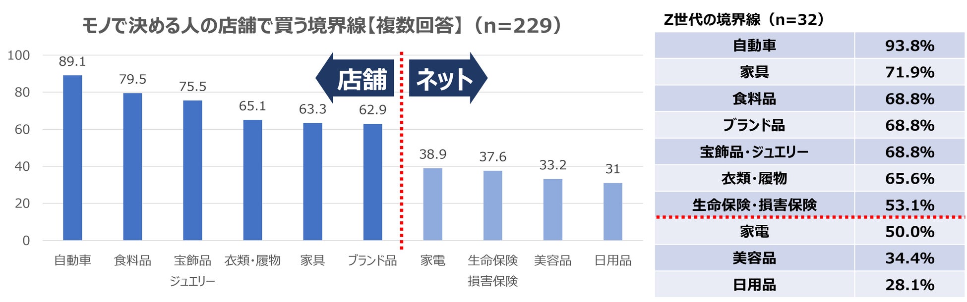 ●商品ジャンルで決める人の境界線は「ブランド品」であれば店舗、「家電」であればネットで買うことが判明。世代別ではZ世代が最も店舗で買いたい項目が多い結果に。