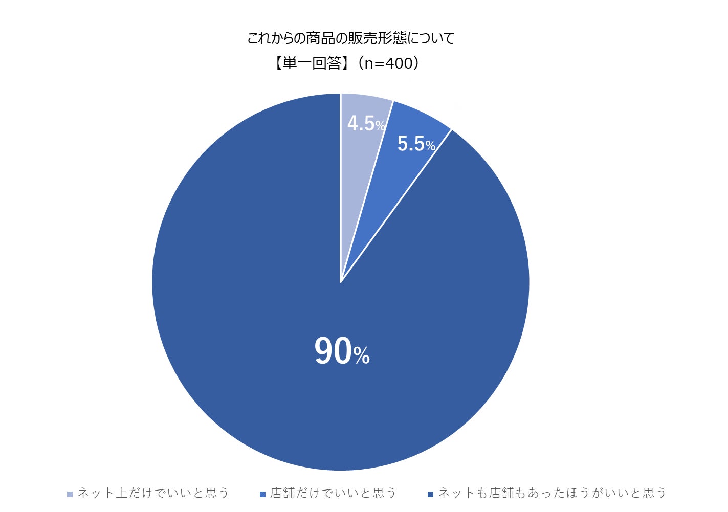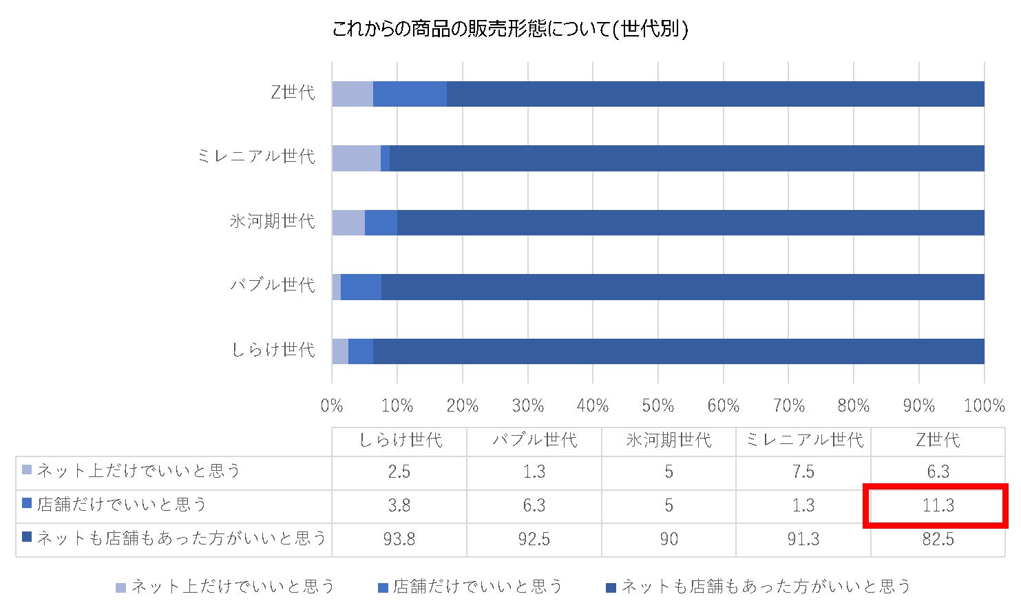 一方で、これからの商品の販売形態について聞いたところ、「ネット上だけでいいと思う/4.5%」「店舗だけでいいと思う/5.5%」「ネットも店舗もあった方がいいと思う/90.0%」と、どちらも必要だと考えている人が大半を占める結果となりました。また、世代別ではZ世代の「店舗だけでいいと思う」と回答した割合が11.3%と、店舗販売に対して他世代と違った結果が見受けられました。