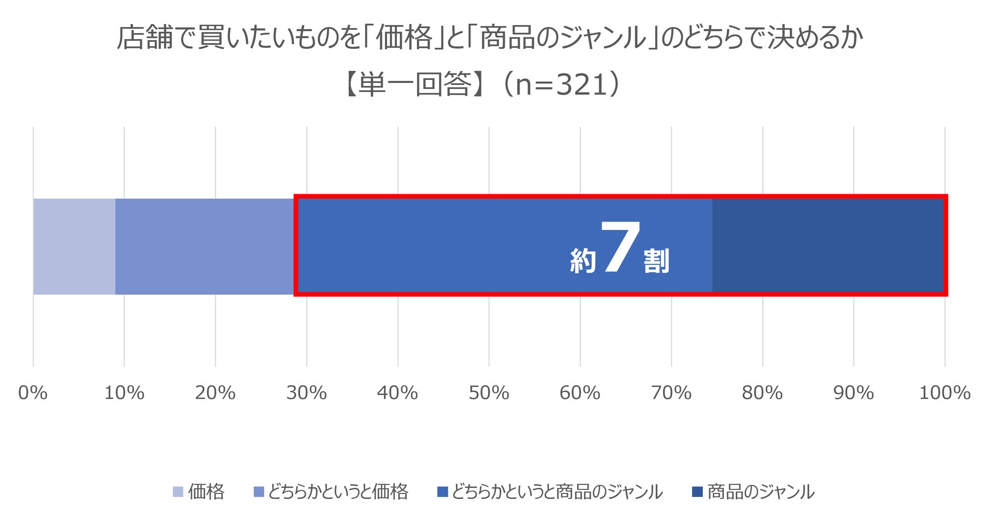 店舗で買いたいものを「価格」と「商品のジャンル」のどちらで決めているか聞いたところ、「価格/9.0%」「どちらかというと価格/19.6%」「どちらかというと商品のジャンル/45.8%」「商品のジャンル/25.5%」と、全体では7割ほどが商品のジャンルで店舗での購入を決めていると回答しました。