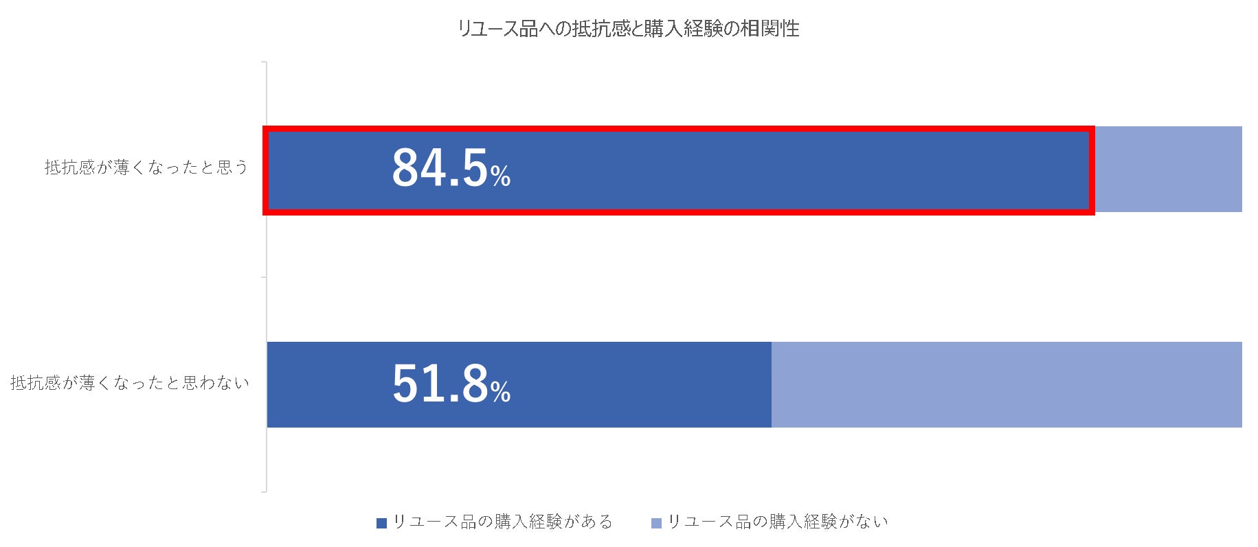 ●リユース品購入への抵抗感が薄くなったと感じている人が43.5%。Z世代が2人に1人以上(51.3%)がリユースへの抵抗感が最も薄く、バブル世代が最も強い結果に。また、リユース品に対しての抵抗感の薄くなったと感じている人に限定すると8割超がリユース品の購入経験があると回答。