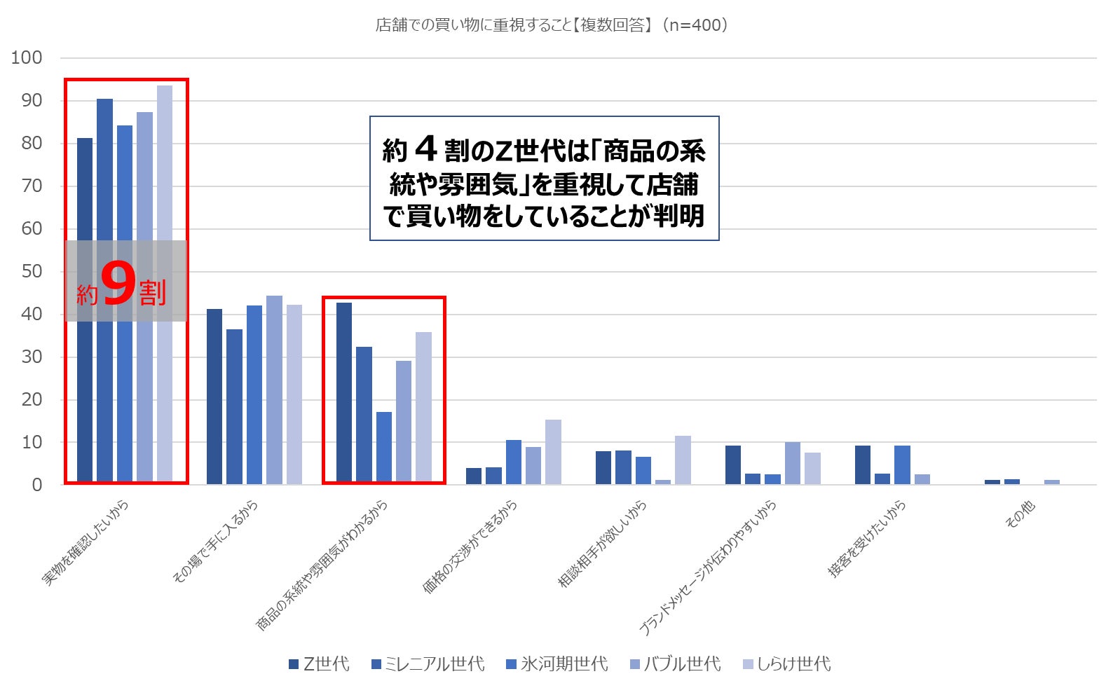 ●店舗があった方がいいと回答した人の理由は「実物を確認したいから/87.4%」が最も高く、世代別ではZ世代の「商品の系統や雰囲気がわかるから/42.7%」が他世代よりも高い結果に。
