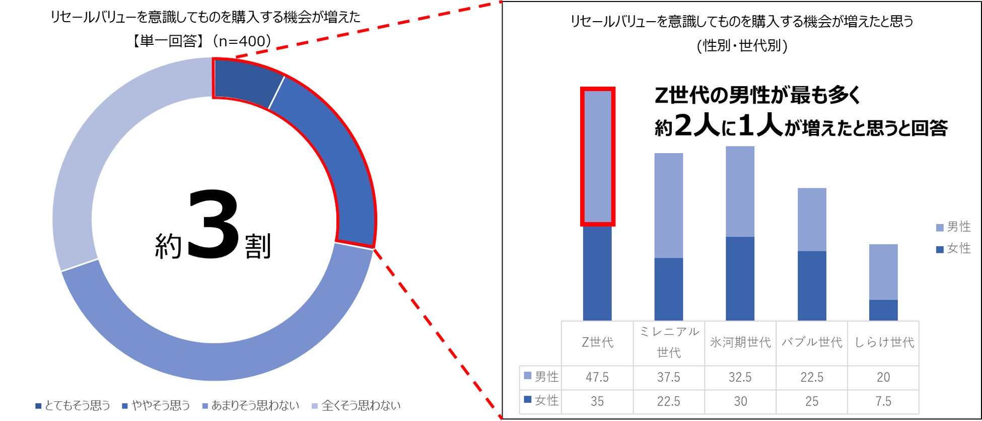 ●買い物をするときにリセールバリューを意識してモノを購入する機会が増えた人が約3割。Z世代の男性が最も高く、47.5%の人が増えたと回答。