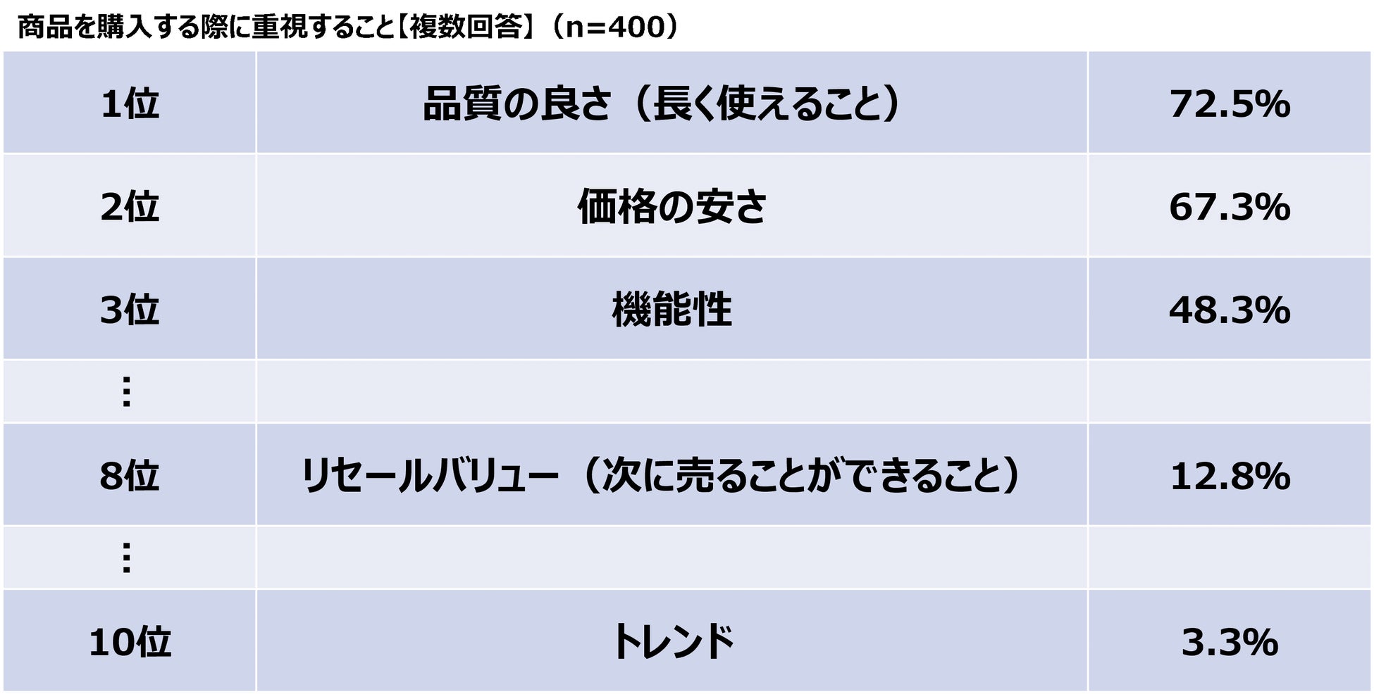続いて、買い物をするときに重視することを聞いたところ、上位3つは「品質の良さ(長く使えること)/72.5%」「価格の安さ/67.3%」「機能性/48.3%」という結果になりました。ランキング内ではトレンドを重視している人よりもリセールバリュー(次に売ることができること)を重視している人が多く、コスパの良さを意識した買い物をしている人が多いことがわかります。