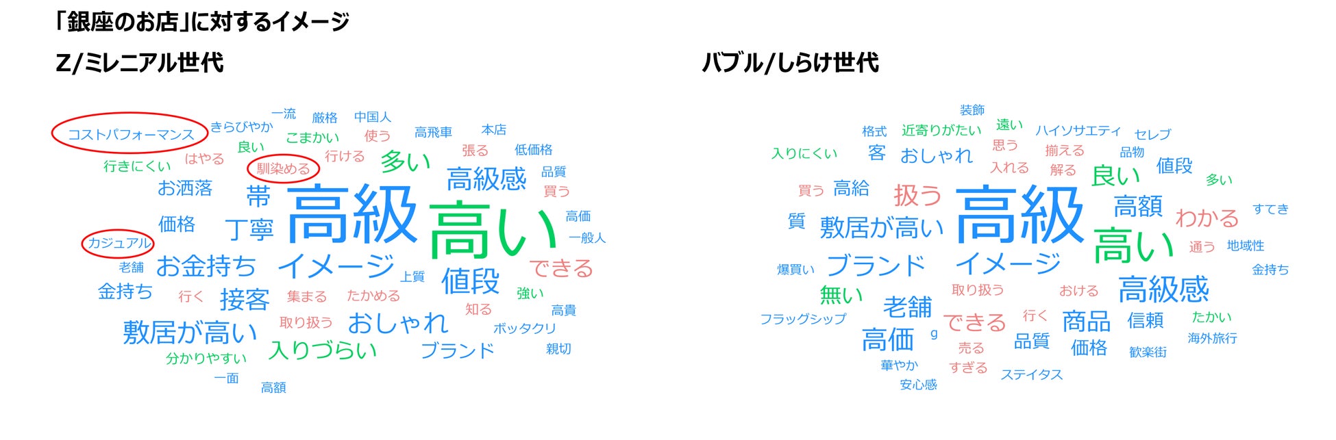 ●銀座のイメージについて全世代で「高級」「ブランド」「品質」等を持っている一方、世代間でギャップもあり、Z/ミレニアル世代では「コストパフォーマンス」「馴染める」などの回答も。