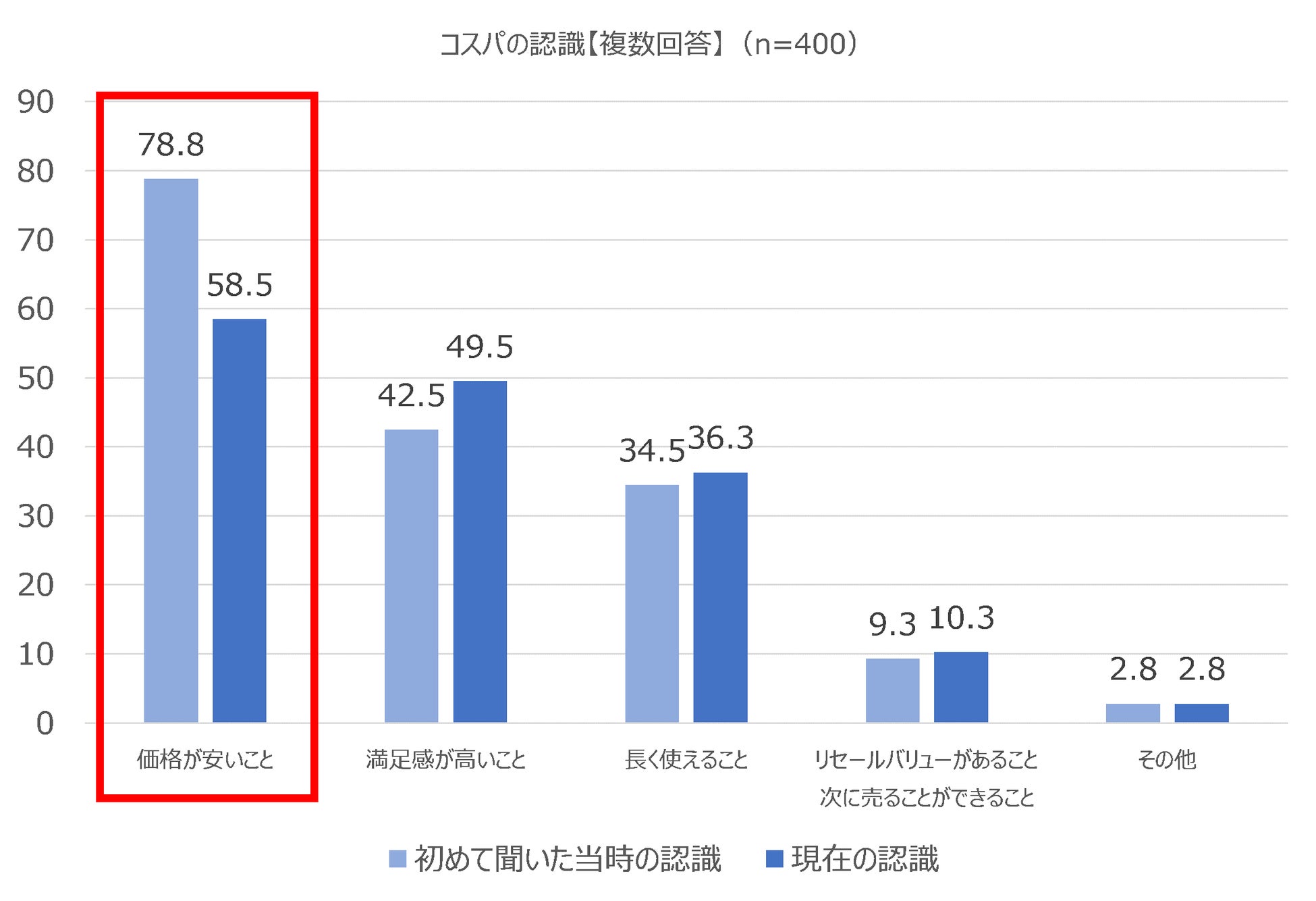 また、「コスパの良さ」という言葉に対する認識としては、初めて聞いた当時は78.8%の人が価格の安いことを想起していましたが、現在の認識としては58.5%まで下がっており、「コスパの良さ=価格の安さ」だけではなく、購入価格以外の価値基準も強くなっていることが窺えます。