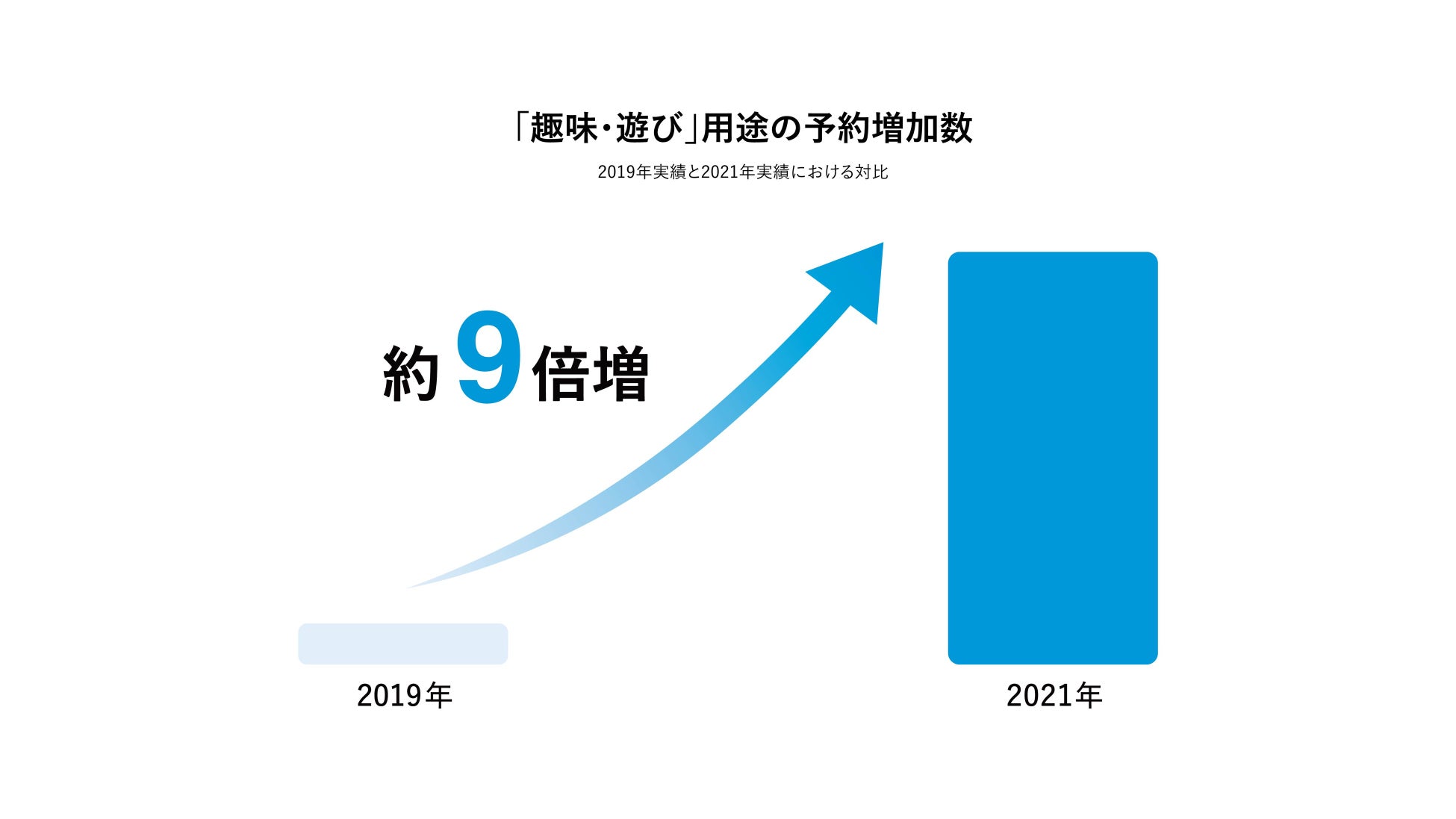 また、生活様式の変化において、趣味や各種イベント、パーティー、フィットネスなど、ライフスタイルの充実を求める機運も高まっています。特に「ウィズコロナ」「アフターコロナ」をきっかけに、レンタルスペースというプライベート空間に少人数で集まり、個人の時間を共通の趣味で楽しむ人が増え、おしゃべり会、料理、ボードゲーム、推し活などの「趣味・遊び」でのレンタルスペース利用が増加し、ビジネス用途に続く人気カテゴリとして上昇しています。